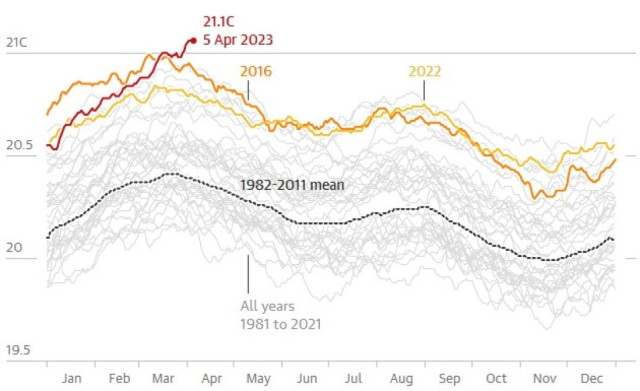 Водночас вчені побоюються, що надалі ситуація може погіршитися. Дані кліматичної моделі свідчать про те, що тепло підіймається до поверхні океану, що вказує на потенційну модель Ель-Ніньйо в тропічній частині моря вже до кінця поточного року. Якщо це станеться, кількість хвиль тепла суттєво зросте, а люди зіткнуться з низкою екстремальних погодних умов, що призведе до подальших глобальних рекордів тепла.Як змінювалася глобальна температура океану