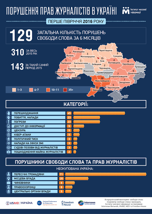 За перше півріччя 2016 року експерти Інституту масової інформації зафіксували в Україні 129 випадків порушень свободи слова, порівняно до 143 випадків за аналогічний період 2015 року. У п'ятірку регіонів-«лідерів» за кількістю порушень ввійшла і Волинь.