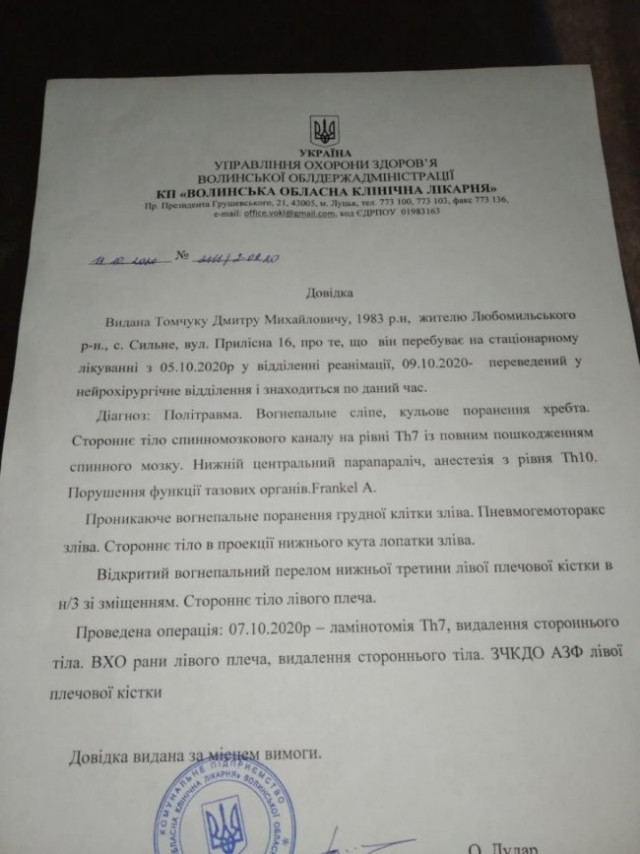 Зазначається, що чоловік 1983 року народження, отримав вогнепальне поранення хребта з повним пошкодженням спинного мозку, повідомляє Район.Любомль.