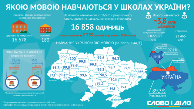 Найбільше шкіл, де викладання ведеться не українською, у відсотковому співвідношенні - на сході й півдні країни (навіть без зони АТО і Криму): в Донецькій (40,5%), Луганській (34,9%), Одеській (30,6%), Харківській (27,1%) і Запорізькій (24,6%) областях. А от абсолютним лідером за кількістю українськомовних шкіл є Рівненщина: там 100% таких шкіл. Показник 99,9% мають Волинська й Тернопільська області, 99,6% – Вінниччина й Чернігівщина, 99,5% – Київська і Житомирська області. У Києві україномовними є 97,1% шкіл (при цьому російськомовні школи складають 2,7%).