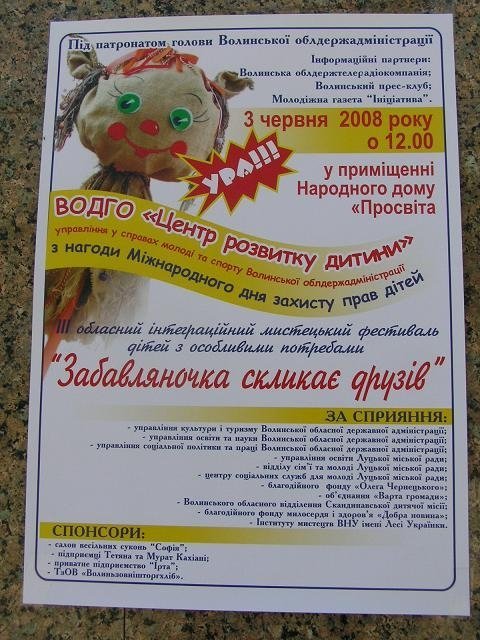 Як повідомляє репортер «Волинських новин», 3 червня у приміщенні Народного дому «Просвіта» відбувся ІІІ обласний інтеграційний мистецький фестиваль дітей із особливими потребами «Забавляночка скликає друзів».