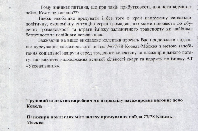 Залізничники просять своє найвище керівництво продовжити подальше курсування пасажирського поїзда №77/78 «Ковель – Москва» з метою запобігання соціальної напруги серед трудового колективу та пасажирів потягу, що викличе надходження великої кількості скарг та вдарить по іміджу «Укрзалізниці».