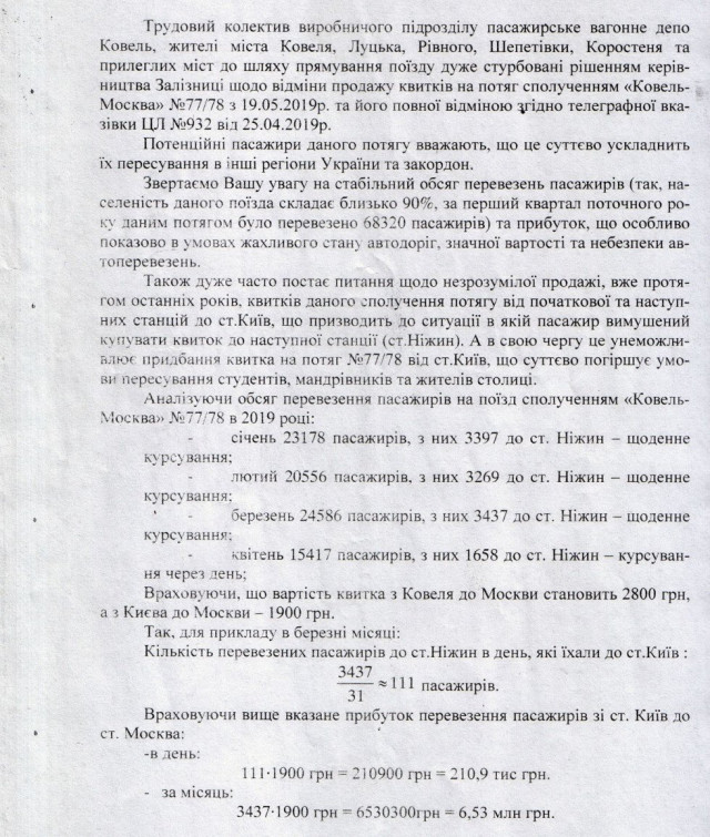 Трудовий колектив виробничого підрозділу «Пасажирське вагонне депо Ковель», жителі Ковеля, Луцька, Рівного, Шепетівки, Коростеня та інших прилеглих міст до шляху прямування поїзду дуже стурбований рішенням керівництва АТ «Укрзалізниця» щодо відміни продажу квитків на потяг сполученням «Ковель – Москва» №77/78 з 19 травня 2019 року та його повної відміни, згідно телеграфної вказівки ЦЛ № 932 від 25 квітня 2019 р.