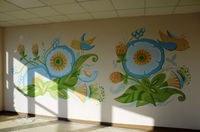 «Ми намагалися створити такі композиції, що виконуватимуть арт-терапевтичну дію. Дуже багато розробили ескізів. Думали зупинитися на пейзажах, та сама назва проекту «Барви надії» говорить про те, що це має бути композиція, яка вселяє надії на народження дитини, одужання та щасливе життя. Тому для сюжетів обрали рослинні мотиви з елементами українських декоративних розписів», – розповідає Алла Жупанюк.