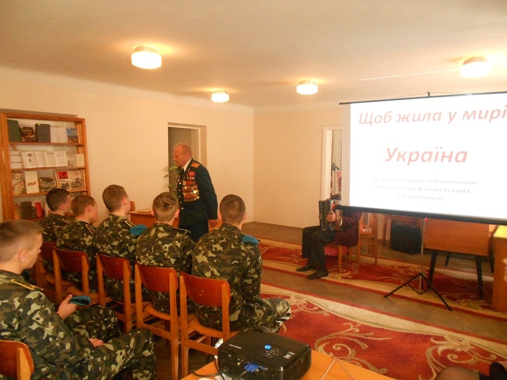 З нагоди святкування 69-ої річниці визволення України від фашистських загарбників в читальній залі бібліотечної-філії №4 у Луцьку відбувся історичний урок «Щоб жила у мирі Україна» за участю ветеранів Великої Вітчизняної війни з курсантами Волинського обласного ліцею з посиленою військовою підготовкою.