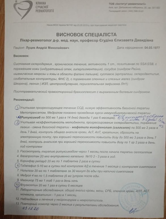 Під час останньої консультації в лікаря-ревматолога, доктора меднаук, професорки Єгудіної В.Д. (грудень 2020 року), медики колегіально вирішили змінити лікування, тому що протягом трьох років немає бажаного результату саме щодо склеродермії.