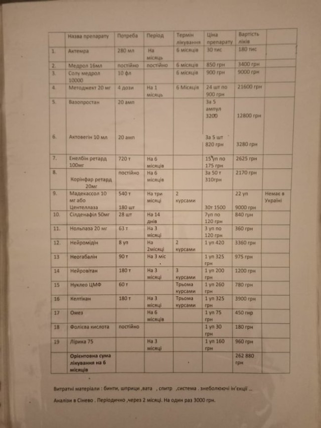 За новим призначенням лікарі рекомендують застосувати дороговартісні препарати, серед яких – рідкісний препарат «АКТЕМРА». На сьогодні орієнтовна сума лікування Луцика – 290 тисяч гривень.