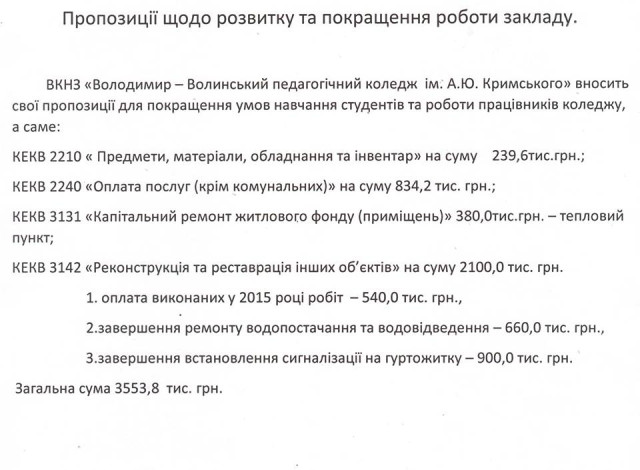 А ще керівники подають пропозиції, як можна покращити роботу цих закладів, пропозиції щодо розвитку та перспективне бачення. Одним з закладів. які подали такі пропозиції, є й Володимир-Волинський педколедж імені А.Ю. Кримского.