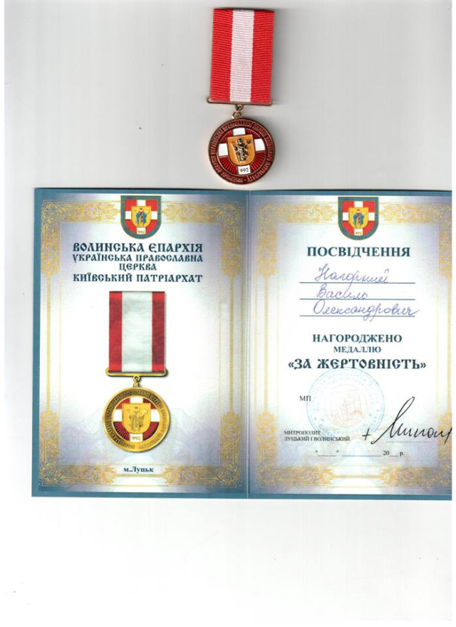 Волинський правозахисник Василь Нагорний отримав церковну відзнаку «За жертовність». Про це він повідомив на своїй сторінці у мережі.