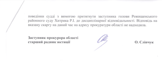 Невідомо, чи сприяли родинні зв’язки «вирішувати» проблеми, що почалися після ДТП. Однак у середу 30 травня на сайті Вищої кваліфікаційної комісії суддів України з’явилося повідомлення про те, що суддя Рожищенського районного суду Руслан Хитрик не відповідає займаній посаді.