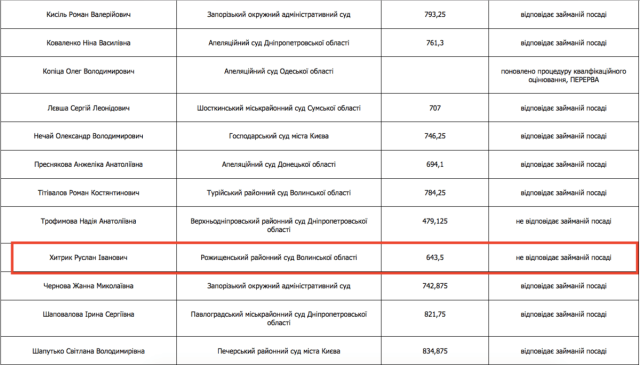 30 травня 2018 року на засіданнях колегій Вищої кваліфікаційної комісії суддів України проводилися співбесіди та визначалися результати кваліфікаційного оцінювання 19 суддів місцевих та апеляційних судів на відповідність займаній посаді. 12 визнано такими, що відповідають займаній посаді. Серед них і наш земляк – суддя Турійського районного суду Роман Тітівалов. А от суддю Рожищенського районного суду Руслана Хитрика визнано таким, що не відповідає займаній посаді. Він набрав 643 з половиною бали, а це один з найнижчих результатів. Загалом з 19 суддів лише три не пройшли співбесіду.