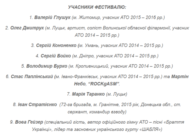 Прибуде на Любомльщину виконати свій репертуар й Вова Гейзер – автор офіційного гімну АТО (пісні «Браття Українці»), лідер та засновник українського гурту «ШАБЛЯ».