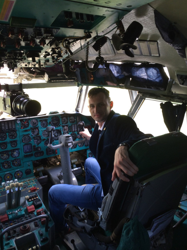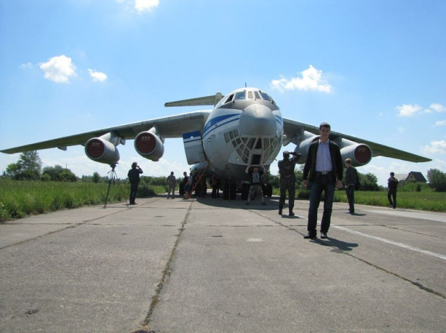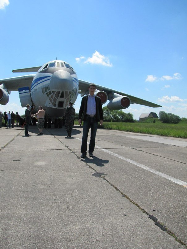 Разом з ним ми сіли в автобус і поїхали до літака. Поки ми фотографувалися біля Іла, Саша відкрив бортовий люк і опустив трап. По ньому ми піднялися у вантажний відсік Іла, потім пройшли в кабіну екіпажу. Весь цей час Саша спокійно і з посмішкою відповідав на запитання, які сипалися на нього градом, розхвалював літак, який був одним з найбільш "молодих" в усьому авіапарку Іл-76МД на Україні, із захопленням розповідав про закордонні місії, в яких йому пощастило побувати, зокрема про польоти в Гренландію під данським прапором, коли на цьому літаку вони перевозили на науково-дослідні станції крижаного острова паливо, обладнання та медикаменти. Також розповідав про сьогоднішню ситуацію в Україні, про інтенсивні польоти, які тривають вже 4 місяці практично без посадок. Незважаючи на сильну втому, Саша виглядав бадьоро і тримався підтягнуто, як і личить справжньому офіцеру. Наприкінці екскурсії ми майже подружилися. Саша був лише на два роки старший за мене, 1984 року народження. На прощання я потиснув йому руку і подякував за приділений час, побажавши йому чистого мирного неба та м'яких посадок.