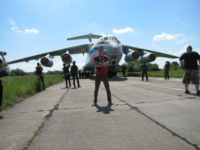На фото: член "ОВАЛ " Богдан Шклярський на фоні збитого Іл-76МД з бортовим номером 76777: