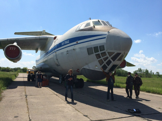 На фото: член "ОВАЛ✈" Павло Коширецьу вантажному відсіку і на тлі збитого Іл-76МД з бортовим номером 76777.