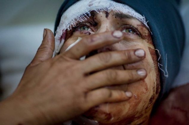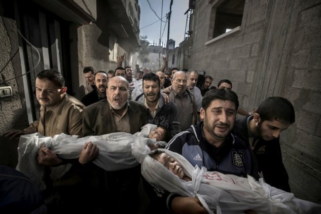 Краще фото року. 20 листопада 2012. Після ізраїльського авіанальоту на палестинські території в Секторі Газа був зруйнований будинок, в результаті чого загинуло двоє дітей та їхній батько. На фото видно похоронну процесію, що прямує в мечеть.