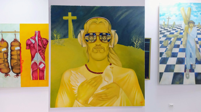 «Земля, яка родить хрести» – перша робота 2014 року, коли почалася війна. Таких полотен тут кілька. Такий мій відгук. Наша земля – найродючіша в Європі, але вона просякнута кров’ю. Золота земля кровоточить. Тому й кольори такі – чорні й червоні, тривожні…Пришестя сучасного Христа