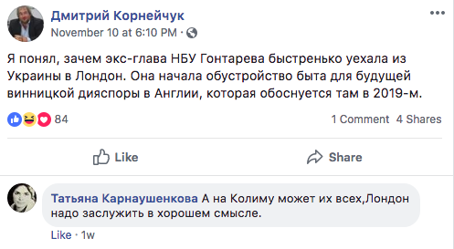 «Я зрозумів, для чого екс-глава НБУ Гонтарева швиденько поїхала з України в Лондон. Вона почала облаштувувати побуту для майбутньої вінницької діаспорі в Англії, яка влаштується там в 2019», - іронізує на своїй сторінці у Facebook політолог Дмитро Корнійчук.