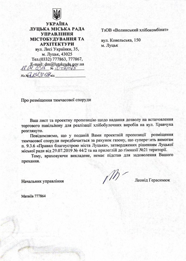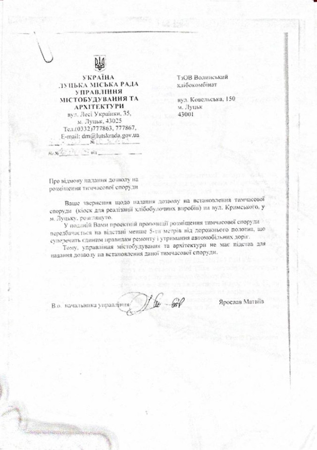 Тому, як пише підприємець, його обурило, коли міська влада заборонила розташування торгівельного павільйона на вулиці Кравчука, а Сергій Григоренко та Ярослав Матвіїв проігнорувалит зауваження підприємця щодо схожого павільйону Ковельського хлібокомбінату, який встановили з двома порушеннями: «Розміщення тимчасової споруди на відстані не менше 5-ти метрів від дорожнього полотна, що суперечить єдиним правилам ремонту і утримання автомобільних доріг» та «розміщення тимчасової споруди передбачається за рахунок газону, що суперечить вимогам п. 9.3.6 «Правил благоустрою міста Луцька»».