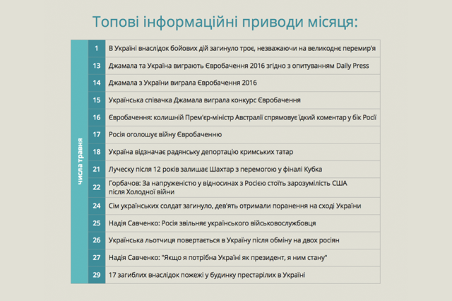З 13 по 17 травня темою дня була перемога Джамали: від перших опитувань до переказу подій конкурсу та політичних обговорень довкола змісту пісні і геополітичної ситуації. Найпопулярнішим став матеріал CNN за 15 травня «Українська співачка Джамала виграла конкурс Євробачення» (понад 40 тис. лайків, поширень і коментарів у Facebook і Twitter).