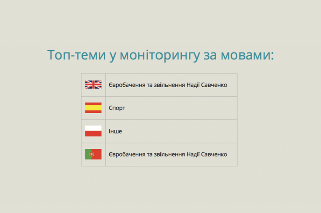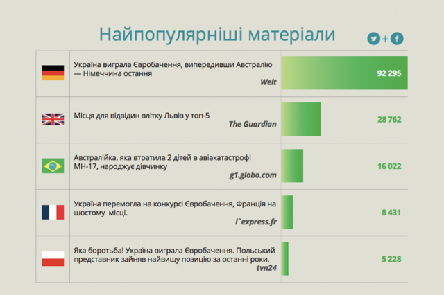 Що не дивно, найпопулярніші матеріали про Україну за соціальним резонансом у німецькому, французькому та польському інформаційних просторах стосувалися Євробачення. Португальською, щоправда, найбільш поширюваним став матеріал про народження дівчинки австралійкою, яка втратила 2 дітей в авіакатастрофі МН-17 – ця аварія все ще викликає інформаційний резонанс щодо України.