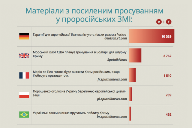 У проросійських англійськомовних ЗМІ панувала конспірологія. Так, найбільш розповсюджуваним став матеріал «Морський флот США планує тренування в Болгарії для штурму Криму» (SputnikNews), німецькою наполягали на тому, що «гарантії для європейської безпеки існують тільки разом з Росією», португальською розповідали про українські танки на підході до Криму, Крим з’явився і в французькому Спутніку «Марін ле Пен готова буде визнати Крим російським, якщо її оберуть президентом». А польською іронізували з приводу того, що «Порошенко оголосив Україну берегинею європейської цивілізації».