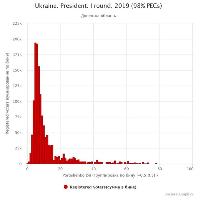 Разом з тим електоральний географ Олександр Кірєєв, який проживає в США, і Роман Удот, опублікували діаграми, які, за їхніми словами, показують великомасштабні відхилення від нормального розподілу голосів в Донецькій області. Вони вважають, що тут не обійшлося без втручання в голосування на користь Порошенка.Дані від опозиції