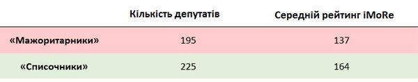 Різниця між "мажоритарниками" і "списочниками" становить майже 30 пунктів на користь останніх. Причина на поверхні: відсутність партійної дисципліни. На відміну від "облікових" депутатів, "мажоритарні" обранці пов'язані з округом вельми формально, і виборці не мають на них дієвих важелів впливу.