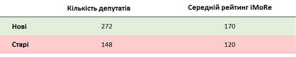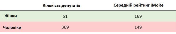 Жінки краще голосують за реформаторські законопроекти. Так, у 51-ї народної обраниці середній бал - 169, тоді як 369 чоловіків заробили в середньому по 149 балів. Мінімальний рейтинг серед жінок - у Юлії Льовочкіної (2, "Опозиційний блок"), максимальний - в Олени Бойко (250,6, "Народний фронт").Факт 3. Досвід заважає депутатам, новобранці - ефективніші.