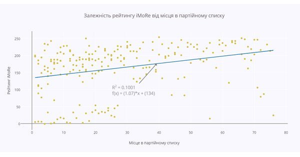 Депутати, які посідають високі місця в списках партій, гірше голосують за реформаторські законопроекти. Ступінь залежності рейтингу iMoRe від місця в партійному списку вкрай незначний (R2 = 0,1). Якщо подивитися на рейтинги топових представників партій, можна побачити зовсім різні цифри.