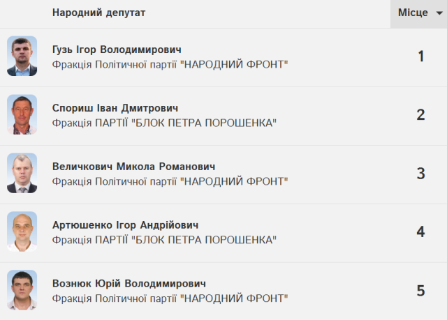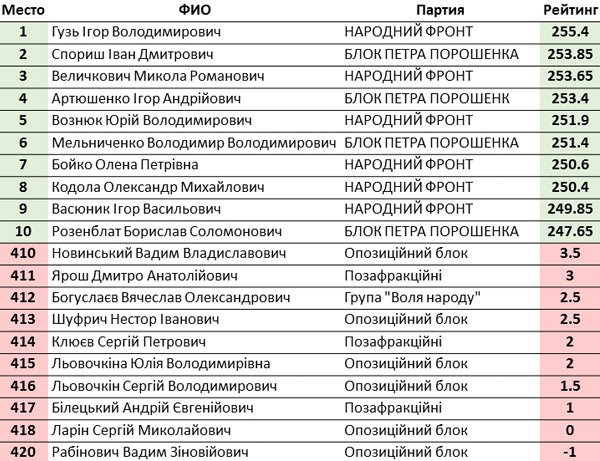 У загальному рейтингу перша десятка зазнала помітних змін. У топ-10 з'явилося відразу п'ять депутатів: Ігор Гузь ("Народний фронт", +14), Ігор Артюшенко (БПП, +10), Володимир Мельниченко (БПП, +11), Олена Бойко ("Народний фронт", +6), Олександр Кодола ("Народний фронт", +15).