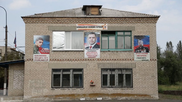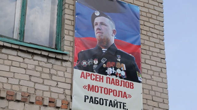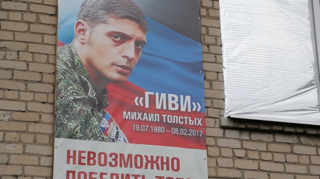 Так званий «пантеон» угруповання «ДНР» – портрети загиблих бойовиків Михайла Толстих на прізвисько «Гіві», колишнього очільника донецьких сепаратистів Олександра Захарченка і російського найманця Арсена Павлова на прізвисько «Моторола». Всі троє були вбиті в тилу на окупованому Донбасі протягом 2016 −2018 років.Плакати з пропагандою зображують загиблих лідерів бойовиків