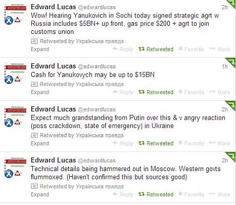 «Чув, що Янукович в Сочі сьогодні підписав стратегічну угоду з Росією, яка включає 5 мільярдів, в тому числі передоплата, ціна на газ 200 доларів плюс угода про приєднання до Митного союзу», - написав на своєму Twitter Лукас.