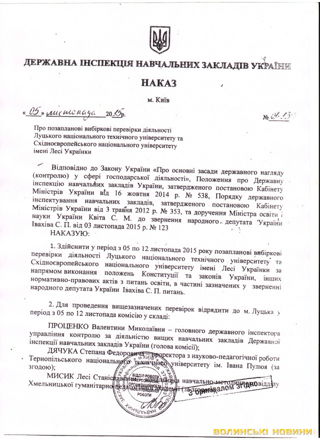 "Здійснити у період з 5 по 12 листопада позапланові вибіркові перевірки діяльності Луцького технічного університету та Східноєвропейського національного університету імені Лесі Українки за напрямком виконання положень Конституції та законів України, інших нормативно-правових актів з питань освіти, в частині зазначених у зверненні народного депутата України Івахіва С.П питань", - йдеться у наказі.