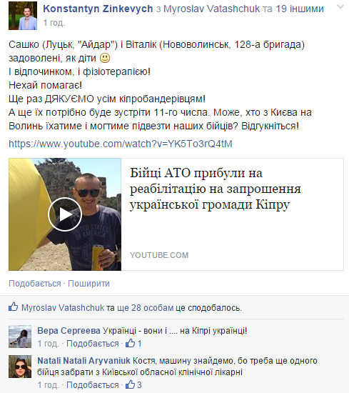 Двоє військових з Волині – Сашко з Луцька, служив у батальйоні «Айдар», та Віталік з Нововолинська, ніс службу у 128-ій гірсько-піхотній бригаді, – 11 травня повертаються в Україну з реабілітації на Кіпрі. Про це на сторінці Громадської організації «Об'єднання Активіст» у Фейсбуці написав волонтер Костянтин Зінкевич.