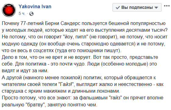 Журналіст Іван Яковина вирішив провести президенту лікнеп і підказав, як насправді подобатися молоді:«Чому 77-річний Берні Сандерс користується шаленою популярністю у молодих людей, які ходять на його виступи десятками тисяч?