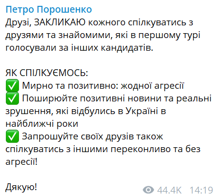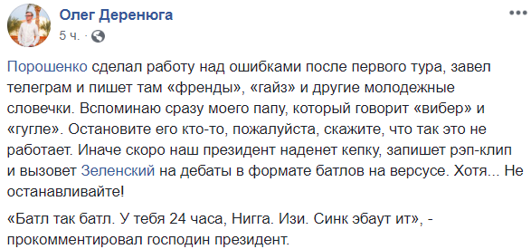 «Гайз, закликаю кожного спілкуватися з друзями та знайомими, які в першому турі голосували за інших кандидатів», – написав Порошенко в одному з повідомлень 7 квітня.В цей же день президент виклав в телеграм відеозвернення про те, що «зробив висновки» з критики на свою адресу. У ньому він звернувся до своїх прихильників і опонентів словом "Френди«.В іншому пості він закликав створювати групи за Петра Порошенка в соцмережах. І додав Let’s do it!Після раптового переходу на інтернет-сленг, соцмережі почали тролити Порошенка. І він відредагував всі повідомлення, замінивши «френди» і «гайз» на більш нейтральне "друзі".«Здаров, бандити!»: реакція соцмереж
