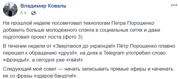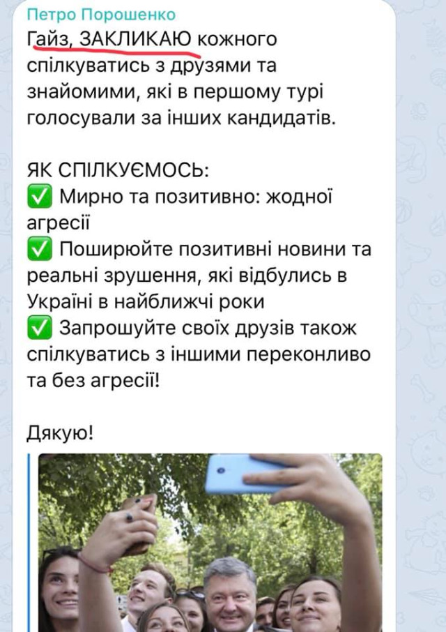 «Протягом тижня від «звертаюсь до українців!» Петро Порошенко плавно перейшов до звернення «друзі!», днями в Telegram вжив слово «френди!», а сьогодні вже «гайз!».