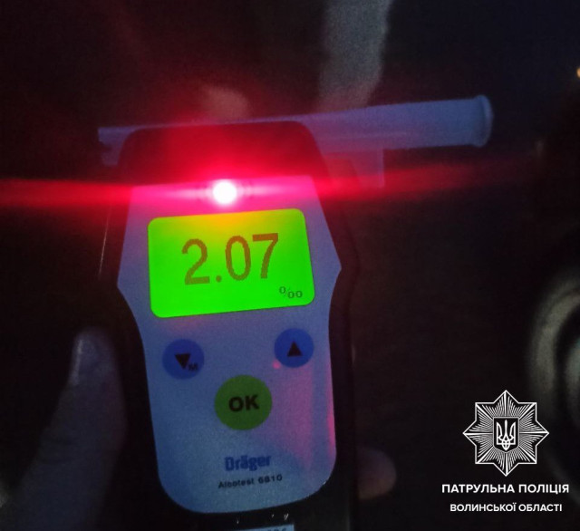 Керманич пройшов огляд на визначення стану алкогольного сп’яніння на місці зупинки. Результат – 2,07 проміле, що в 10 разів перевищує допустиму норму.