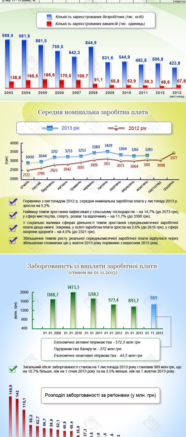 У цілому, по країні в листопаді 2013 року у порівнянні з листопадом 2012 року рівень середньої номінальної зарплати піднявся на 5,2%.
