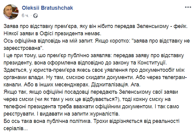 Український журналіст Олексій Братущак надіслав в офіс президента офіційний запит з приводу заяви про відставку, яку нібито подав Олексій Гончарук. У Зеленського відповіли, що такої заяви прем'єр-міністра зареєстровано не було.