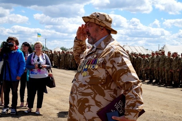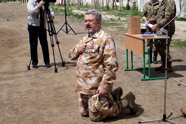 Потому до слова запросили протоієрея, підполковника запасу Миколу Гінайла. Стоячи на колінах перед військовиками, він подякував їм за мужність та побажав перемоги.