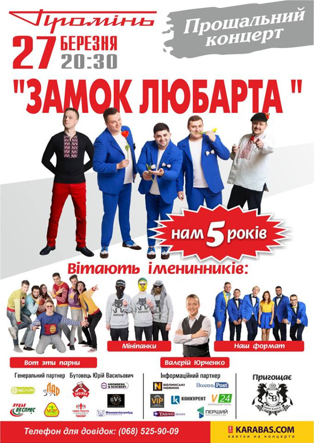 Купити квитки на концерт команди Замок Любарта можна онлайн - ТУТ. Оплата готівкою можлива при покупці в касі у РЦ "Промінь".