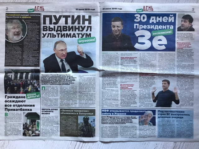 Продовження «інтерв’ю» розмістили на третій сторінці. Натомість друга заповнена низкою «новин» про те, що нібито вже трапилося за президентства Володимира Зеленського: відміна безвізу, загострення агресії, відмова МВФ від співпраці, появу «зелених чоловічків» у Запоріжжі тощо.