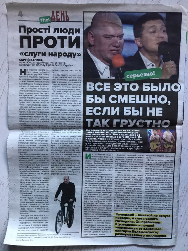 На останній сторінці розміщена ще одна критична публікація та стаття «Прості люди проти «слуги народу», підписана кандидатом у Президенти Сергієм Капліним. У ній громадян закликають не вестися на «дешевий пропагандистський балаган ЗЕ-Коломойського».