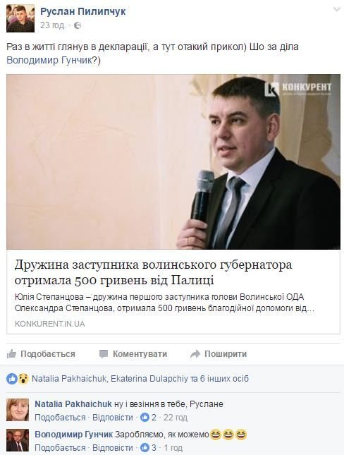 Благодійну допомогу у розмірі 2,5 тисячі гривень для дружини свого заступника очільник Волинської ОДА Володимир Гунчик назвав «зароблянням, як можемо».