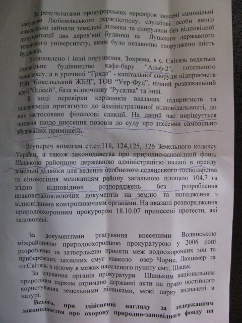 Наразі ж «у селі Світязь ведеться самовільне будівництво кафе-бару «Альф-2», готельного комплексу в урочищі «Гряда» – капітальної споруди підприємств ТОВ «Ковельський ЖБД», ТОВ «Укр-Фуд», нічний розважальний клуб «Одісей», база відпочинку «Русалка» та інші. До відповідальності прокуратурою вже притягнуті керівники цих підприємств, застосовані фінансові санкції, але зараз прокуратура заявить позови про знесення цих самовільно збудованих споруд. Шацькою РДА були надані в оренду земельні ділянки для ведення особистого селянського господарства та сінокосіння мешканцям району загальною площею 104,7 гектара згідно відповідних розпоряджень без розроблення відповідних документів. Знаєте, як вони роблять? Спочатку беруть під сінокосіння, наче б то як для добрих діл, беруть у людей документи, дають їм по 10 доларів, а далі будуються кафе і бари під видом цього сінокосіння», – висловилася заступник Генпрокурора.