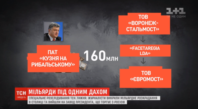 У період від 31 липня до 28 грудня 2017 року «Ленінська кузня», яка ще тоді належала президенту, перерахувала 160 мільйонів підприємству «Євромост», власник якого – російський «Воронежстальмост». Але щоб так сильно не підставлятись, до ланцюга долучають португальську прокладку Facetaregia LDA, директор якої, чомусь з українським прізвищем Мисько. За контрактом між «Євромостом» та португальцями, сума поставки вже не 160 мільйонів, а 85. Хтось поклав собі в кишеню 75 мільйонів. А далі «нібито португальці», купують у «Воронежсталі» металоконструкції.Окрім цього, згідно вантажно-митній декларації, металоконструкції приїхали на «Ленінську кузню» просто з Російської Федерації. Ось чітко це вказано – відправник «Воронежсталь», Росія, отримувач – їхнє же підприємство в Україні «Євромост», на яке «Ленінська кузня» президента відправила 160 мільйонів гривень.