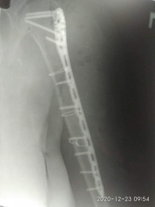 21 грудня їй провели 4-ьох годинну операцію – остеометалосинтез правої плечової кістки за допомогою LCP проксимальної Philos пластини та гвинтів.