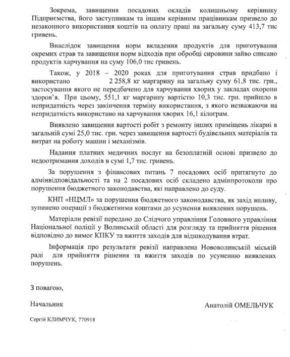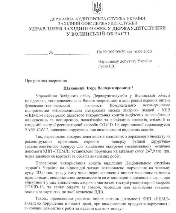 Після звернення народного депутата Ігоря Гузя державна аудиторська служба України провела перевірку Нововолинської центральної міської лікарні. Загалом експерти виявили порушень на 924 тисячі гривень при виконанні будівельних робіт, оплаті праці керівництва та неналежного використання «коронавірусних» грошей.